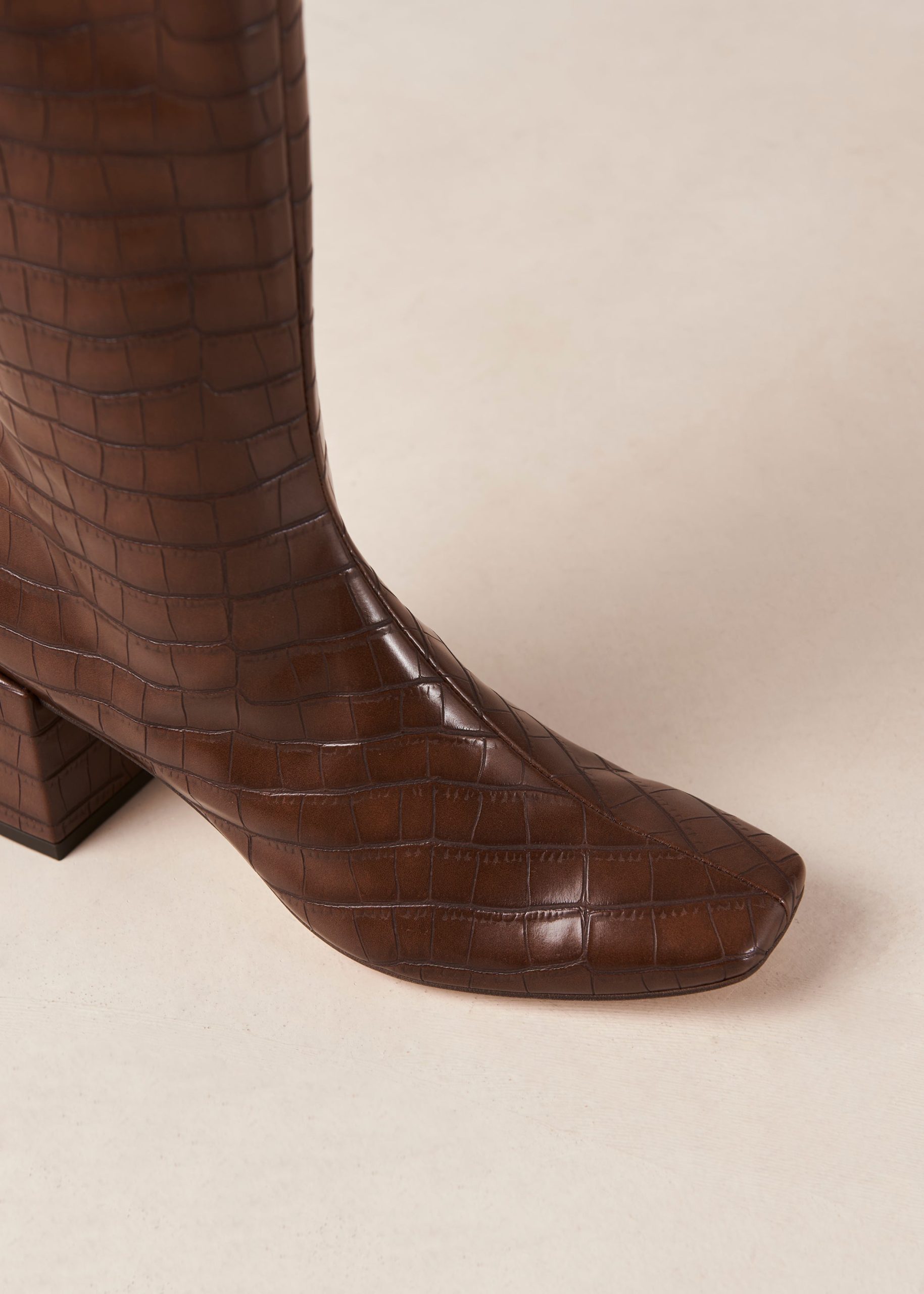Chalk is a vegan boot crafted from brown faux leather with a mock-croc finish. It’s knee-high with a chunky block heel and slim. squared toes. A full-length zipper on the side ensures easy slipping on and off.